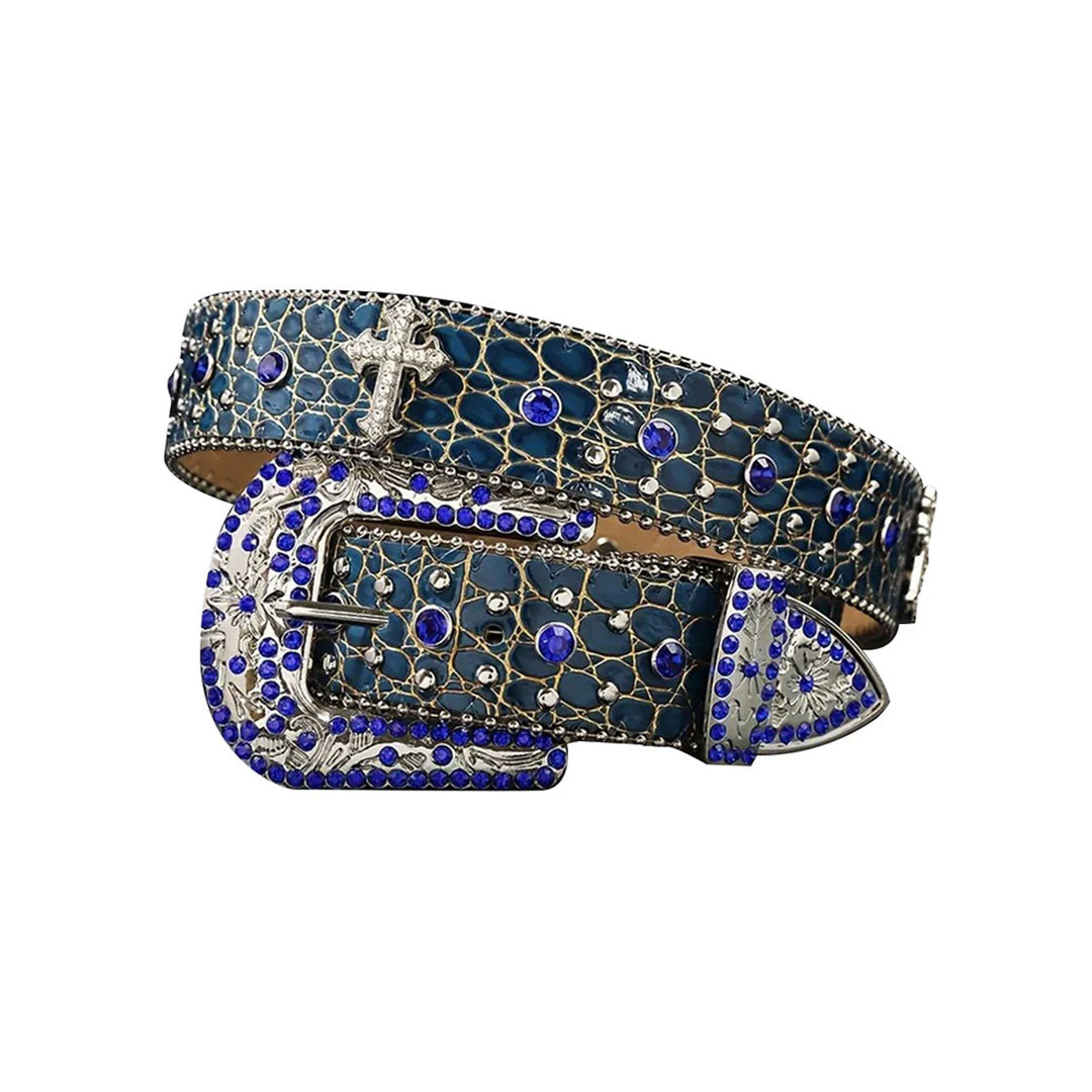 Make a bold fashion statement with our Patterned Blue Strap Belt featuring a Blue Studded Cross Design. Crafted with a stylish patterned strap in rich shades of blue, this belt is the perfect blend of edgy and elegant. The centerpiece—a striking studded cross in matching blue tones—adds a unique, eye-catching detail that enhances any outfit. Ideal for pairing with jeans, skirts, or dresses, this belt brings both personality and flair to your wardrobe. Designed for comfort and durability, it’s a standout accessory for those who love to express their style with confidence.